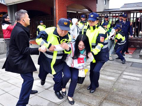 Green Party-Social Democratic Party Alliance legislative candidate Wu Shao-wen (吳紹文) and independent candidate Sun Po-yu had earlier been hauled away from the temple’s entrance after they attempted to protest the negotiations on a cross-strait trade in goods agreement.