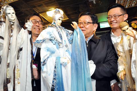In a visit to Jinan Temple (進安宮) in Yilan County’s Nanfangao (南方澳) — accompanied by Want Want Group (旺旺集團) chairman Tsai Eng-meng (蔡衍明) — Chen was greeted from across the road by Falun Gong protesters, who held a banner and signs behind barriers in a designated protest zone.