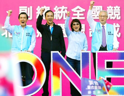 Deputy Legislative Speaker Hung Hsiu-chu (洪秀柱), whose presidential candidacy was rescinded by the party in October nearly three months after she was nominated, also appeared at the event yesterday, standing on the same campaign stage with Chu for the first time since her replacement.