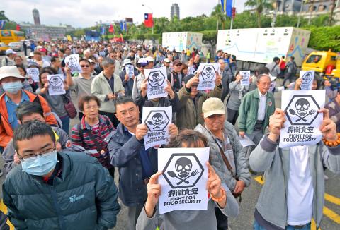 The rally began at 2:15pm on Ketagalan Boulevard to the sound of a rap song created for the event with lyrics including: “We want food safety, to feel safe when we eat,” “Taiwan is famous for delicious food, but now even China is banning tainted food from Taiwan” and “We are against ‘black-hearted’ food.”