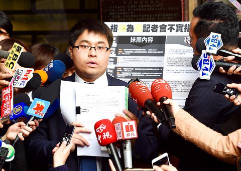 “In the past few days, Alex Tsai, Wang and Chiu have been making false accusations against Tsai Ing-wen with the intention of defaming her,” DPP spokesman Huang Di-ying (黃帝穎) told an afternoon news conference held outside the Taipei District Prosecutors’ Office. “We are filing a lawsuit claiming that they have violated Article 90 of the Presidential and Vice Presidential Election and Recall Act (總統副總統選舉罷免法).”