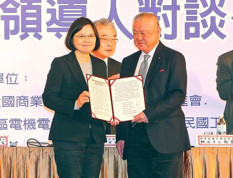 Tsai made the remarks at her first large-scale discussion with the nation’s six major industrial groups, including the Chinese National Federation of Industries (工總) and the Taiwan Electrical and Electronic Manufacturers’ Association (電電公會).