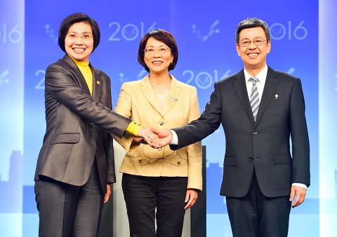 The three vice presidential candidates yesterday faced off in a TV debate, during which they detailed their policies and debated issues ranging from disease prevention, education, and low wages to women’s rights.
