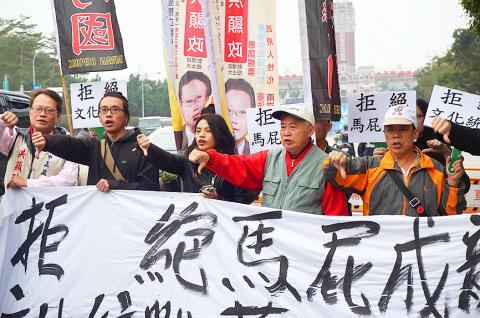 They demanded that the replicas of the 12 zodiac animal heads be immediately removed from the National Palace Museum Southern Branch, while urging Democratic Progressive Party (DPP) presidential candidate Tsai Ing-wen (蔡英文) to dismiss National Palace Museum Director Feng Ming-chu (馮明珠) should she take office.