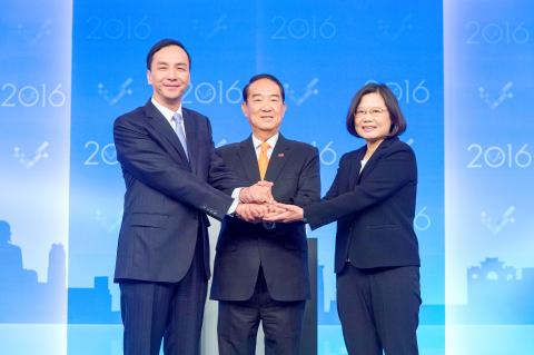 The three presidential candidates yesterday crossed words in the second and final televised debate, with Democratic Progressive Party (DPP) candidate Tsai Ing-wen (蔡英文) continuing to question Chinese Nationalist Party (KMT) candidate Eric Chu (朱立倫) over campaign irregularities and the controversial KMT party assets issue, while Chu questioned Tsai’s stance on importing US pork products and People First Party (PFP) candidate James Soong (宋楚瑜) asked Tsai and Chu to clarify their stances on cross-strait economic exchanges.