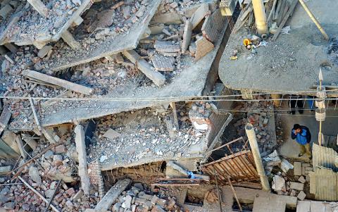 Rescue workers in Imphal used hand-held drilling machines to clear rubble from the ruins of a six-story building under construction, the site of the heaviest damage in the city.