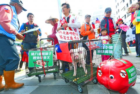 KMT legislative candidate Huang Yao-sheng (黃耀盛) brought two caged piglets to protest Tsai’s perceived inclination to relax the nation’s import regulations on US pork containing ractopamine.
