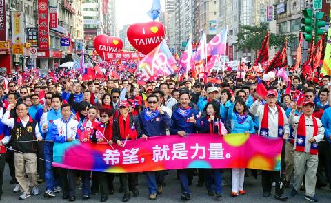 Tens of thousands of supporters of the Chinese Nationalist Party (KMT) yesterday took to Taipei’s streets to drum up support for KMT presidential candidate Eric Chu (朱立倫) and legislative candidates in a march calling for the stability of Taiwan.