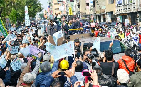 The three presidential candidates’ campaigns converged in Tainan yesterday — “Super Sunday,” the last weekend day of the campaign before Saturday’s elections — where they took part in motorcades, rallies and campaign events in bids to woo southern voters.