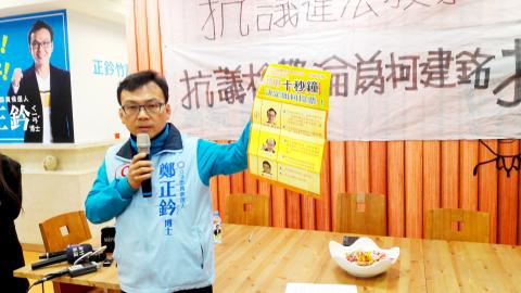 In another development yesterday, Chinese Nationalist Party (KMT) Hsinchu City legislative candidate Cheng Cheng-chien (鄭正鈐) led supporters in a protest outside a local police station in a dispute involving smear campaign literature.