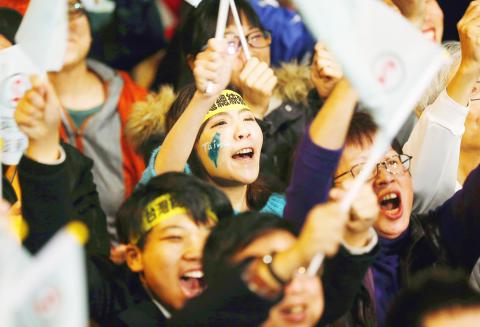 The crowd showed similar responses to news of the DPP’s results in legislative races, whenever the party won a traditionally KMT platform, or when a KMT heavyweight — such as former Taipei mayor Hau Lung-bin (郝龍斌), who ran in Keelung on a KMT ticket — conceded defeat, cries of joy would burst from the crowd.