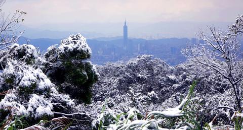 Despite low temperatures, people were seen swarming to elevated areas, including Keelung’s 726m-high Jiangziliaoshan (姜子寮山), Taipei’s Yangmingshan (陽明山) and New Taipei City’s Linkou (林口) and Pinglin (坪林) districts, to appreciate the natural beauty of the snow.