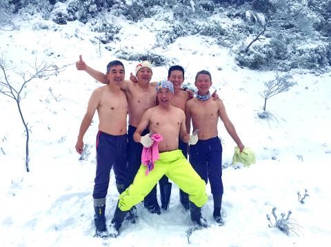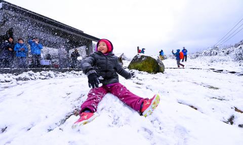 The Motian (摩天嶺-) mountain area along the Southern Cross-Island Highway also reported showers of snow started at 4am yesterday, as well as on Yunlin County’s Jiananyun Peak (嘉南雲峰), where snow began falling at about 11am yesterday at an altitude of about 1,500m.