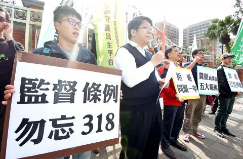 Proposed supervisory regulations governing negotiations with China should not include any language downplaying national sovereignty, civic campaigners said yesterday in a protest outside the Legislative Yuan.