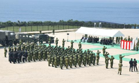 The new Japan Self-Defense Forces base on Yonaguni Island is at the western extreme of a string of Japanese islands in the East China Sea, 150km south of the Diaoyutai Islands (釣魚台) — known as the Senkakus in Japan. The Diaoyutais are claimed by Taiwan, China and Japan.