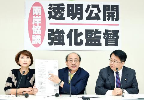 After meeting for more than two hours, DPP caucus members decided on a proposal for a bill to monitor cross-strait exchanges that would allow the legislature to intervene before, during and after a cross-strait negotiation and the signing of a cross-strait deal.