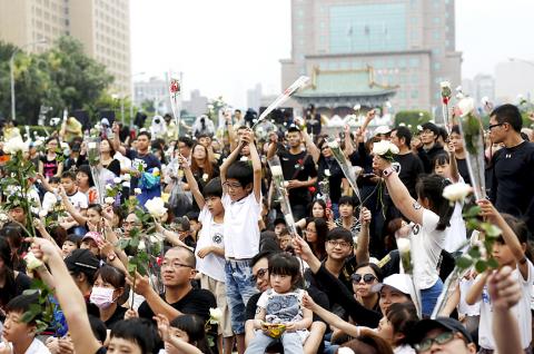 Protesters observed a moment of silence for the four-year old girl, nicknamed “Little Lightbulb” (小燈泡), who died following a random attack last month in Taipei’s Neihu District (內湖).