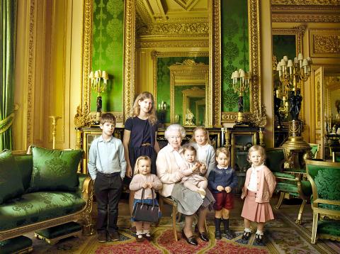 In one photograph, the monarch is pictured with four of her beloved dogs outside the mediaeval castle west of London, and in another she is surrounded by some of the youngest members of her family, including a great-granddaughter clutching one of the queen’s trademark handbags.