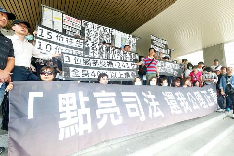 They held up banners that read: “We Want Justice” and placards that demanded that the judiciary investigate possible negligence on the part of the New Taipei City Government and the company that owns the water park.