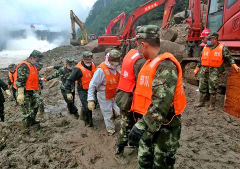 Rescuers aided by experts sent by the central government were searching with tools and sniffer dogs for signs of life, while mechanical diggers hauled away stones and soil, part of a 100,000m3 mountain of rain-saturated debris that buried an office building and a living area for construction workers early on Sunday.