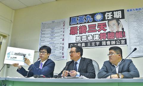 At a news conference at the legislature, DPP Legislator Wang Ting-yu (王定宇) presented a list of 55 promises on which he said Ma has reneged since 2008, notably his “6-3-3” pledge from the 2008 presidential campaign and his promise to donate half of his salary should the “6-3-3” vow fail.