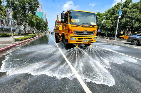 The Taipei Department of Environmental Protection sent water tankers to to cool off some of the city’s main arteries in an effort to combat the fierce heat seen yesterday.