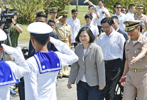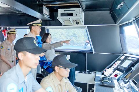 Following an inspection tour of air bases in Hualien on Sunday last week — the first time in her capacity as commander-in-chief of the nation’s armed forces — Tsai visited a naval base in Yilan County’s Suao Township (蘇澳) and boarded the Tuo Jiang, the nation’s first locally built stealth missile corvette that was commissioned in March last year.
