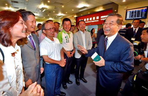 Hsieh arrived at Taipei International Airport (Songshan airport) yesterday morning in the company of dozens of friends and colleagues, including Executive Yuan spokesman Tung Chen-yuan (童振源), as well as Democratic Progressive Party (DPP) legislators Kuan Bi-ling (管碧玲) and Pasuya Yao (姚文智), who were there to see him off.
