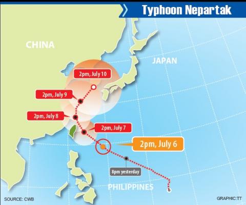 Typhoon Nepartak is expected to be at its closest to Taiwan tomorrow and Friday, the Central Weather Bureau said yesterday.