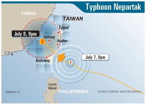 As of 8:30pm yesterday, the center of Nepartak was 180km southeast of Taitung. It was moving northwest toward Taitung at 14kph, according to the Central Weather Bureau.