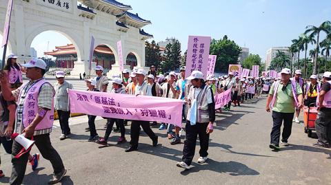 Hundreds of protesters, mainly from Hualien County’s Taroko community, marched from the National Chiang Kai-shek Memorial Hall to Ketagalan Boulevard, waving mock hunting rifles and shouting for revisions to the National Park Act (國家公園法) to recognize traditional hunting rights.