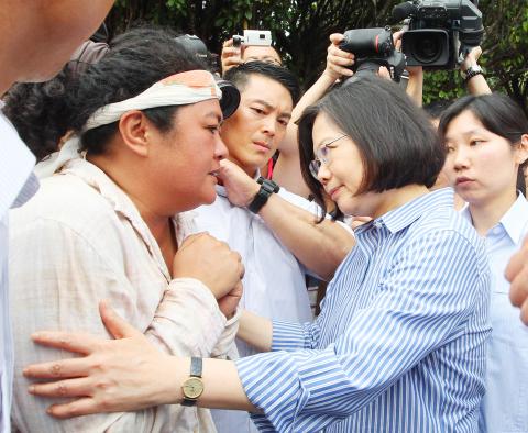 President Tsai Ing-wen (蔡英文) yesterday unexpectedly visited a group of Aboriginal rights activists staging a protest on Ketagalan Boulevard in front of the Presidential Office Building in Taipei, personally answering their questions and promising to help Aborigines to “be themselves.”