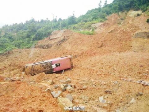 The bus carrying 23 people, including 21 from Taiwan, was hit by a mudslide at 10:43am when the vehicle was traveling in heavy rain along a provincial highway in a mountainous area in Longyan City, bureau officials said, adding that they were exchanging information via cross-strait tourism associations.