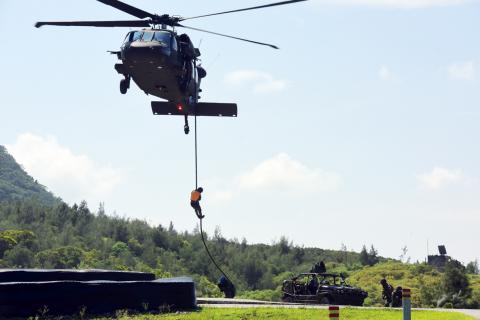 “We were tasked with neutralizing the attack and repelling the enemy from Taichung Port facilities. I led my platoon into the buildings to clear out enemy soldiers one by one for the combat operation. We did our job, and it has been a valuable learning experience for us,” said Lieutenant Lin Kuan-ting (林冠廷), who led a special forces platoon in the exercise.