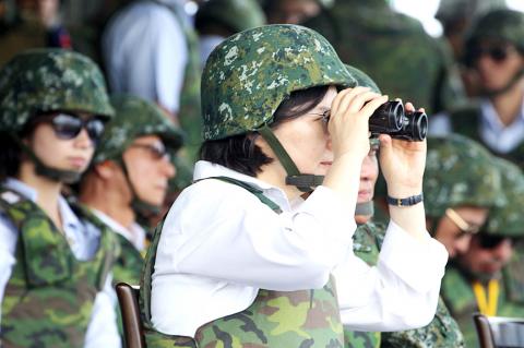 President Tsai Ing-wei (蔡英文), in her role as commander-in-chief, presided over the Han Kuang live-fire drills for the first time after assuming office in May.