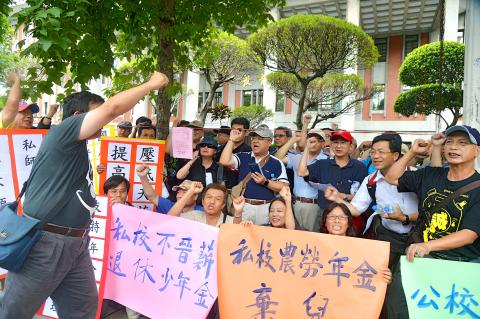 A group of private-school teachers yesterday staged a protest in front of the Ministry of Education to call for the establishment of a fair pension system so that the entitlements of public and private-school teachers are in balance.