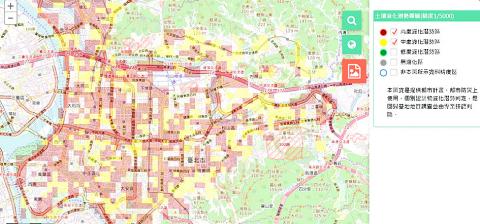 The Taipei City Government yesterday unveiled a map showing areas in the city prone to soil liquefaction, with 26.1 percent of the city having intermediate to high-level soil liquefaction potential.