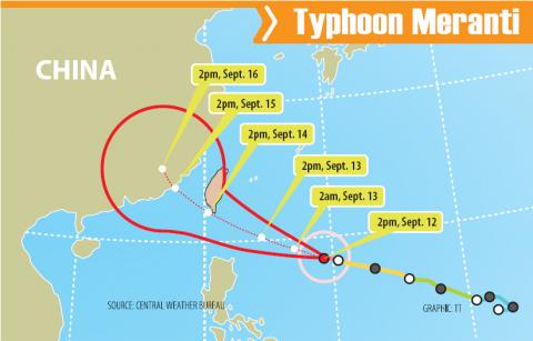 Based on the bureau’s projected path for Meranti, the typhoon’s eye would probably not make landfall in Taiwan.