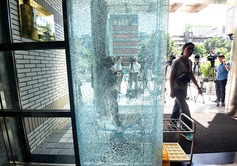 Two men yesterday threw rocks at the front door of the building housing the Ill-Gotten Party Assets Settlement Committee, shattering the glass and prompting Chinese Nationalist Party (KMT) Chairwoman Hung Hsiu-chu (洪秀柱) to say that the committee should operate in “a rational and legal” manner to prevent public backlashes.