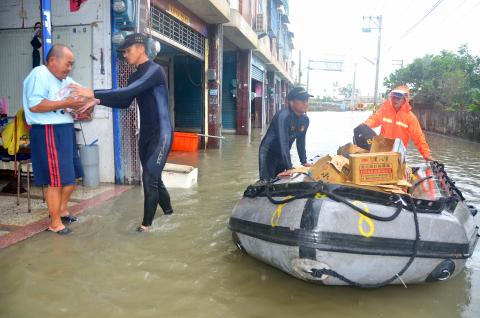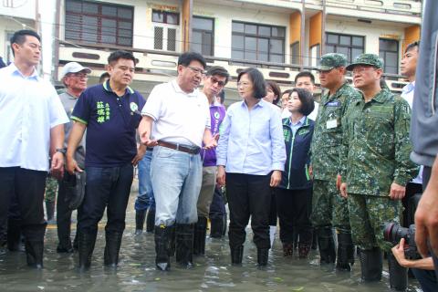 In Pingtung, Tsai met with residents of Jiadong Township (佳冬), which was flooded with waist-deep water, as military personnel delivered food and other supplies to residents stranded in three of the township’s villages.