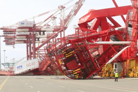 The storm also damaged about a dozen commercial and fishing boats in Kaohsiung Harbor, including a cargo ship under construction that was tossed 300m from where it was moored and slammed into four cranes.