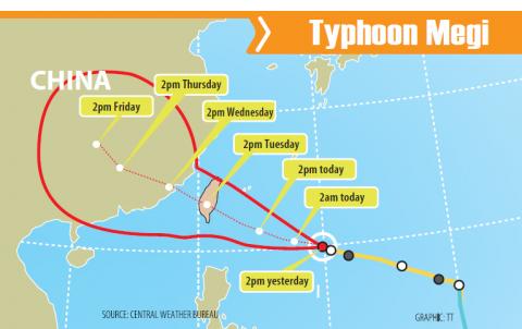 The Central Weather Bureau was scheduled to issue a sea alert for Typhoon Megi as of press time last night, as the storm gained power on its way toward eastern and southern Taiwan.
