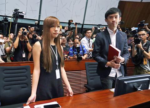 After Yau Wai-ching (游蕙禎) and Sixtus “Baggio” Leung (梁頌恆) of the Youngspiration party entered the Legislative Council’s main chamber, the body’s president ordered them to leave, but the two refused.