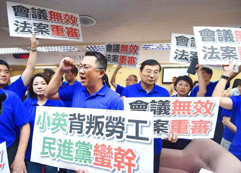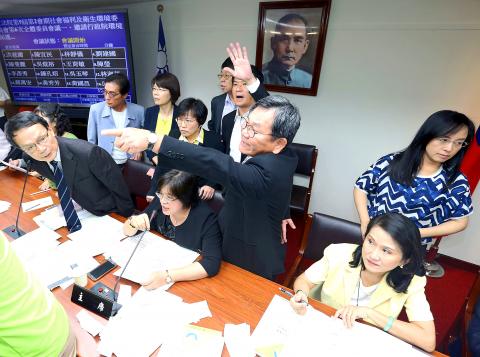 Fighting broke out at a meeting of the Legislative Yuan’s Social Welfare and Environmental Hygiene Committee yesterday as the Democratic Progressive Party (DPP)-controlled committee approved a controversial amendment to the Labor Standards Act (勞動基準法).