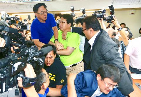 KMT Legislator Arthur Chen (陳宜民) climbed onto the first row of desks in front of DPP Legislator Wu Yu-chin (吳玉琴), one of the committee co-conveners, and engaged in a tussle with DPP Legislator Chiu Chih-wei (邱志偉) before being pushed off by DPP Legislator Su Chen-ching (蘇震清).