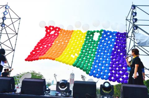 Shortly after the event began, organizers flew a large rainbow flag made of balloons in front of the Presidential Office Building as a message to President Tsai Ing-wen (蔡英文) regarding the public’s demand to legalize same-sex marriage.