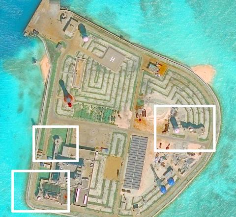 The Asia Maritime Transparency Initiative said it began tracking in June and July the construction of identical hexagon-shaped structures to house the weapons on Fiery Cross Reef (Yongshu Reef, 永暑島), Mischief Reef (Meiji Reef, 美濟礁) and Subi Reef (Jhubi Reef, 渚碧礁), where China has already completed military grade airstrips and installed radar.