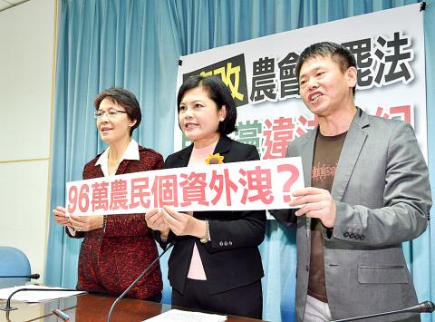 KMT legislators Chang Li-shan (張麗善), Huang Chao-shun (黃昭順) and Lin Wei-chou (林為洲) held a news conference saying that the government had the Council of Agriculture change the Regulations Governing Farmers’ Associations’ Election and Recall (農會選舉罷免辦法) for its own benefit ahead of the elections for agricultural task force team chiefs, deputy chiefs and members’ representatives.