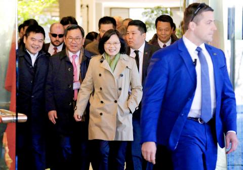 President Tsai Ing-wen (蔡英文) on Saturday arrived in Houston for a brief transit stop on her way to Central America, a routine stopover that has been closely watched by Beijing after US president-elect Donald Trump spoke with her by telephone early last month.