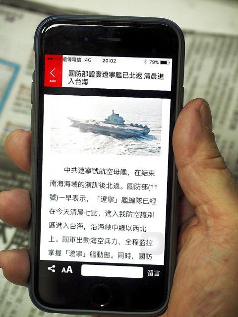 The Soviet-built Liaoning, returning from exercises in the disputed South China Sea, had “operated meticulously” during the navigation of the Taiwan Strait, Chinese People’s Liberation Army (PLA) Navy spokesman Liang Yang (梁陽) said.